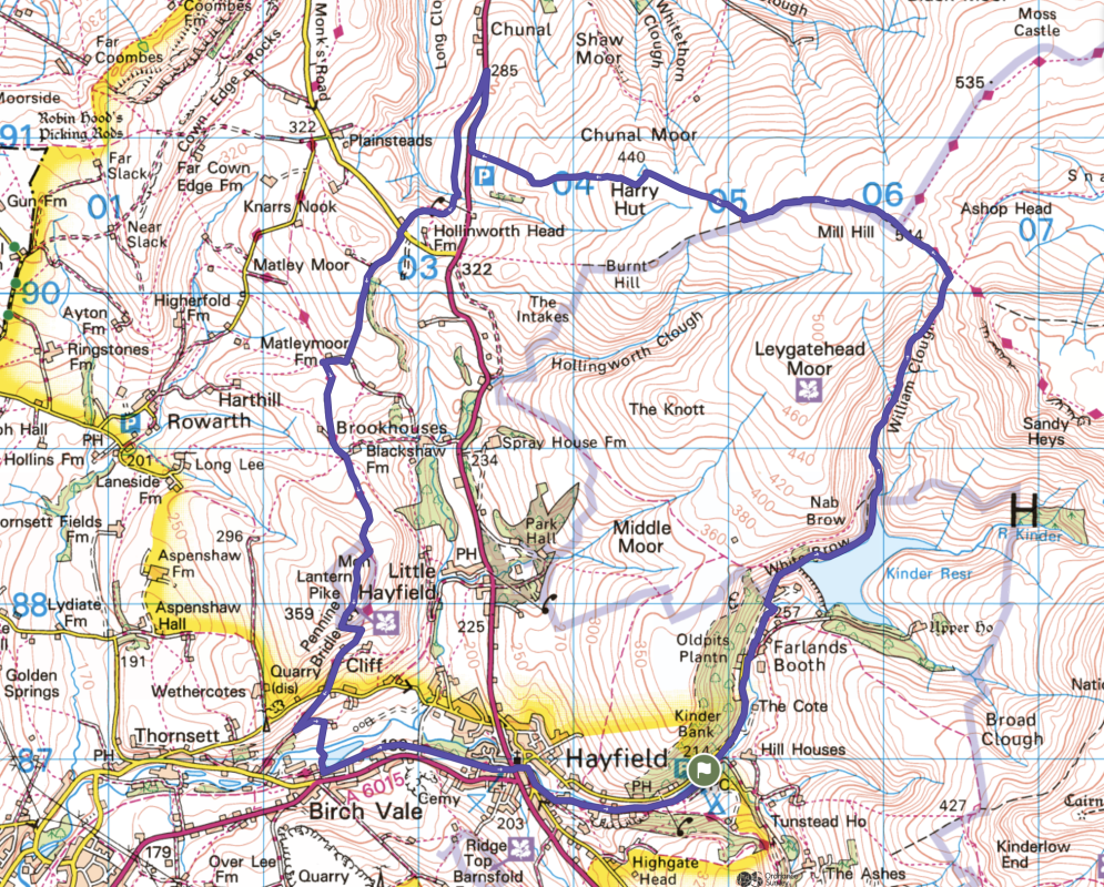 Here you will find details on how to get to the start of the walk at Hayfield, route information, map, GPX file, plus a detailed step by step guide of the walk.
