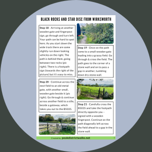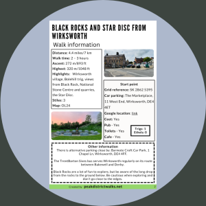 Black Rocks and Star Disc from Wirksworth. Printable A4 PDF which includes walk summary, important information, map, plus step-by-step instructions for the walk. Also handy to download the PDF offline to your Smartphone to take on your walks.