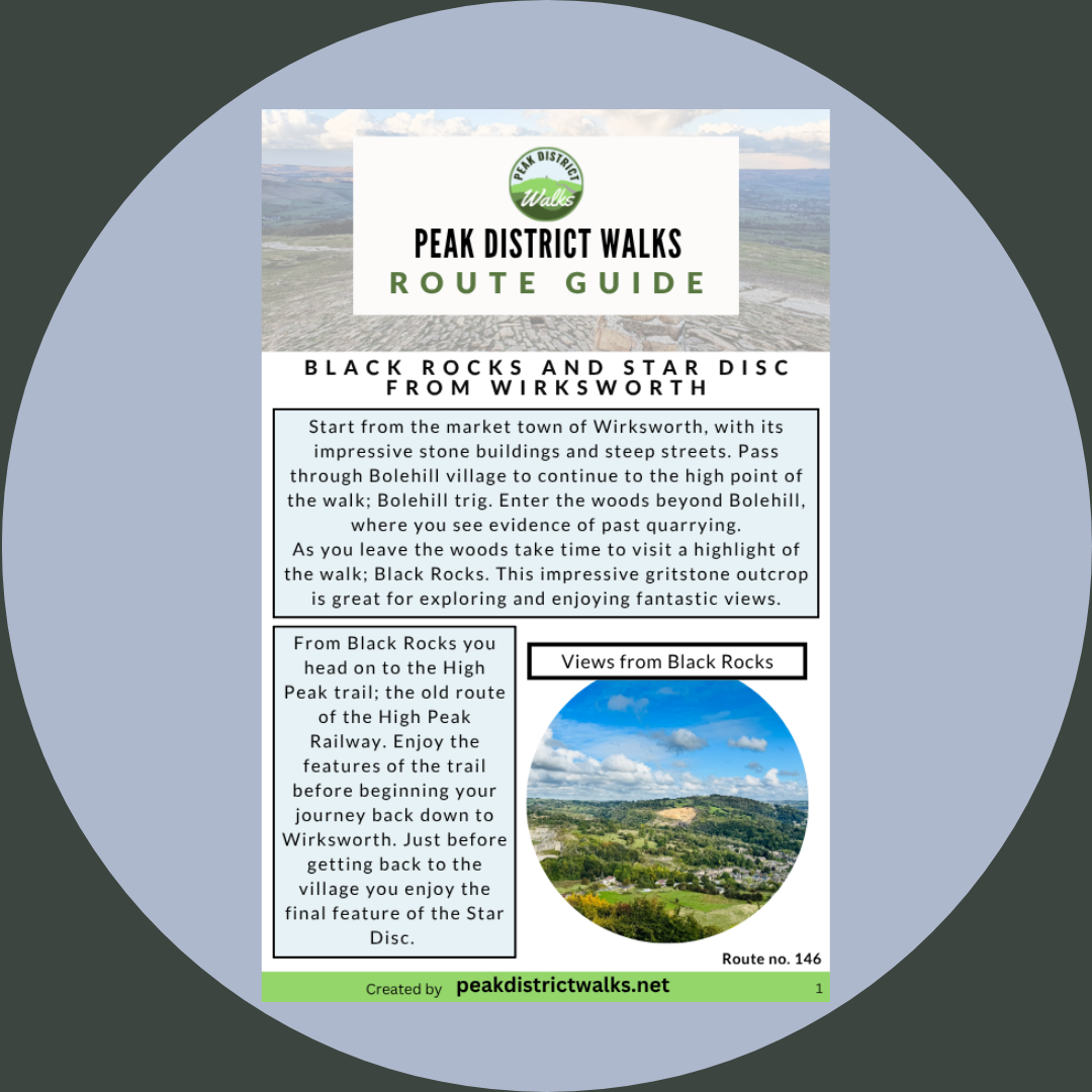 Black Rocks and Star Disc from Wirksworth. Printable A4 PDF which includes walk summary, important information, map, plus step-by-step instructions for the walk. Also handy to download the PDF offline to your Smartphone to take on your walks.