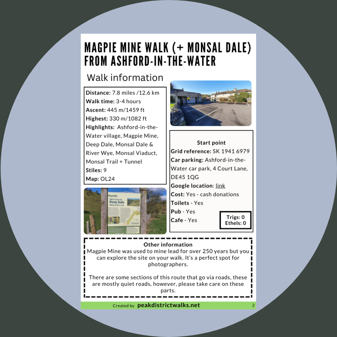 Magpie Mine Walk (+ Monsal Dale) From Ashford-in-the-Water. Printable A4 PDF which includes walk summary, important information, map, plus step-by-step instructions for the walk. Also handy to download the PDF offline to your Smartphone to take on your walks.