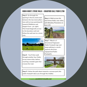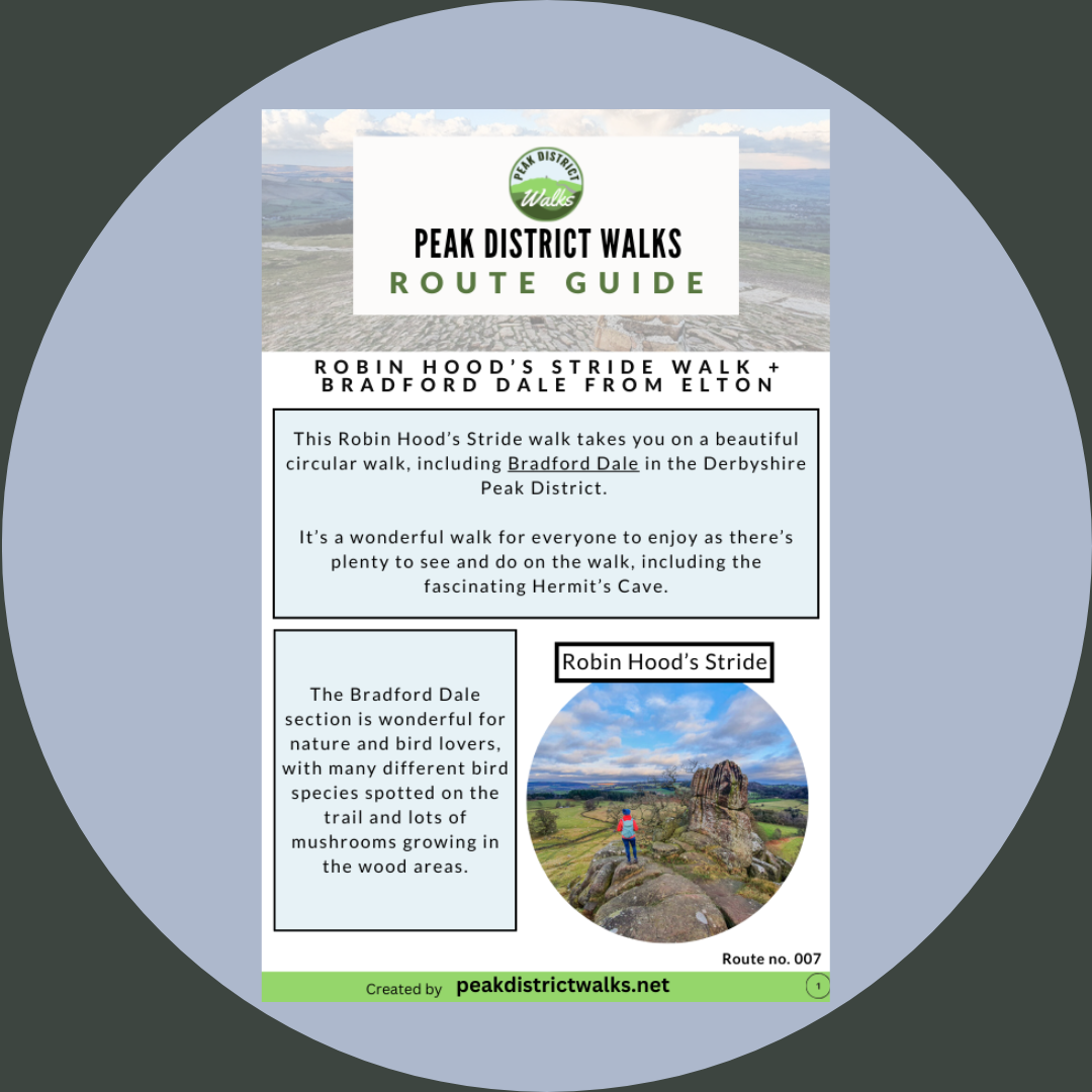 Robin Hood’s Stride + Bradford Dale from Elton. Printable A4 PDF which includes walk summary, important information, map, plus step-by-step instructions for the walk. Also handy to download the PDF offline to your Smartphone to take on your walks.